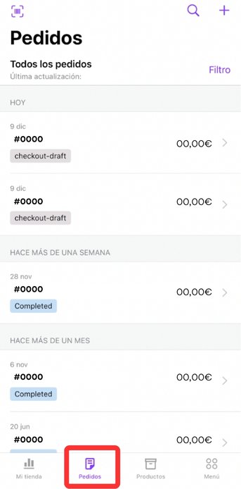 • Si ya tienes pedidos, verás un listado con el número, estado (processing, completed, draft…) e importe.